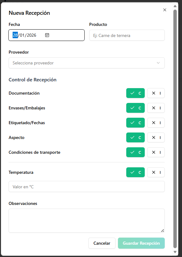 Digitaliza la recepción de mercancías con controles de temperatura, estado del producto, lote y proveedor. Todo queda archivado automáticamente para trazabilidad y auditorías.