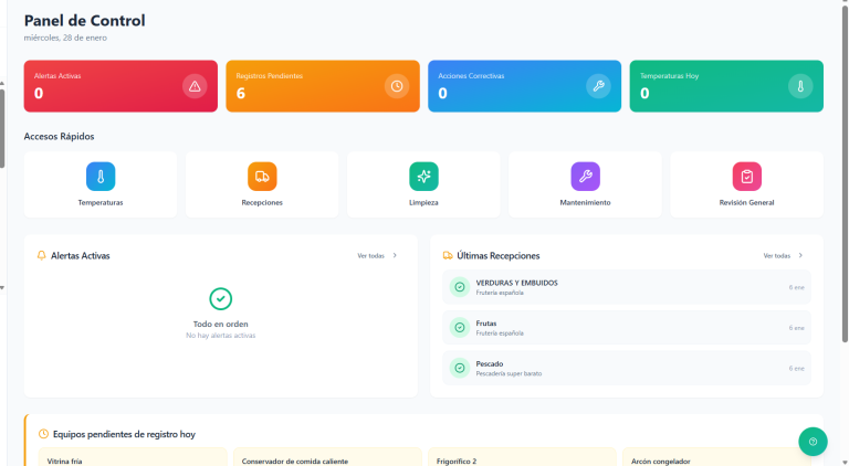 Un panel central donde ves en tiempo real todas las tareas del día, registros completados, incidencias abiertas y alertas importantes. Diseñado para que cualquier responsable pueda saber en segundos si el negocio está cumpliendo con el APPCC.